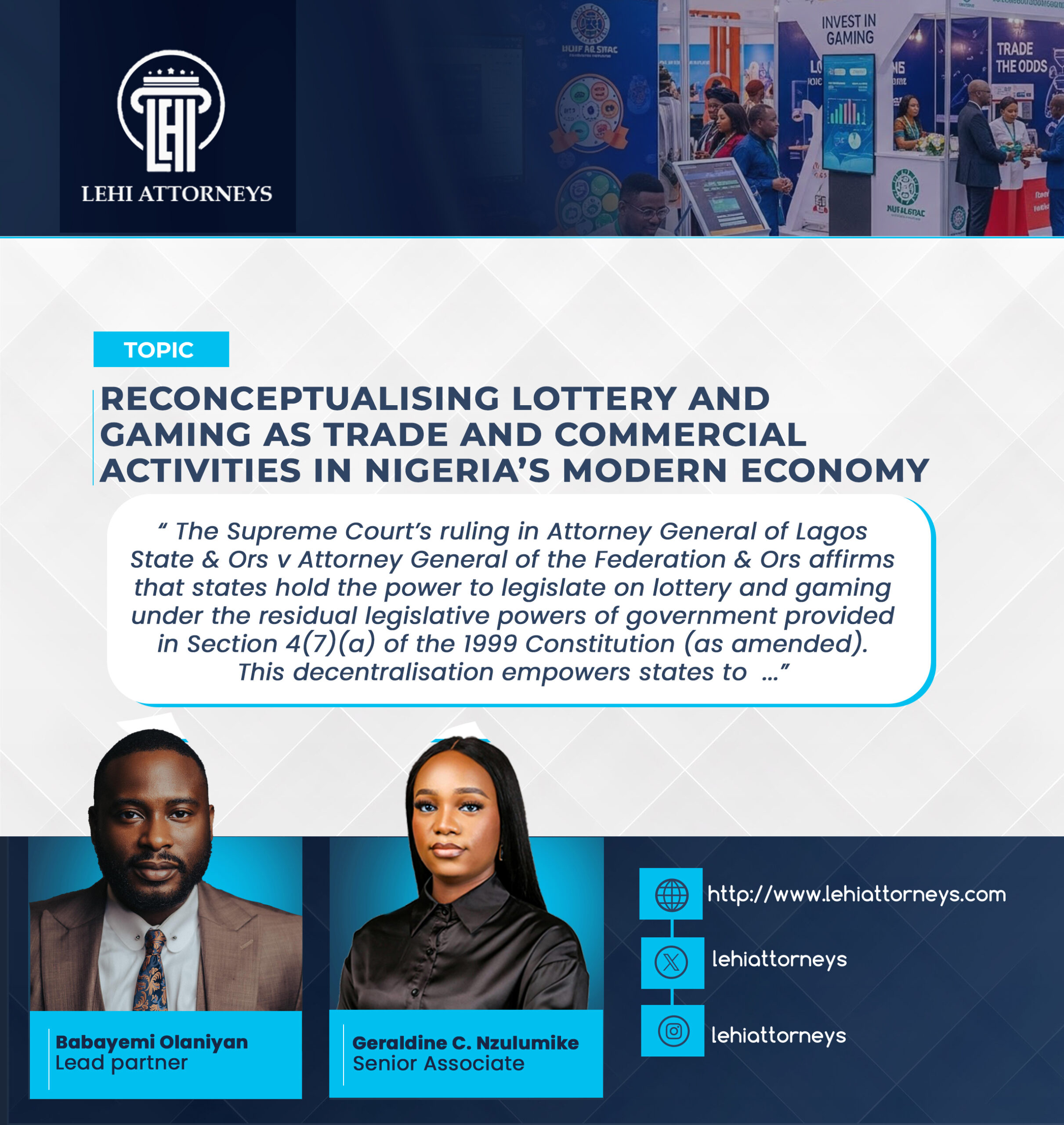 The Supreme Court’s decision in Attorney General of Lagos State & Ors v Attorney General of the Federation & Ors (Suit No. SC/1/2008) affirms state autonomy within Nigeria’s federal structure. However, the judgment highlights the need for thoughtful state-level regulatory frameworks that balance economic development, consumer protection, and industry innovation. Lottery and gaming services operate through organised markets, continuous economic exchange, and revenue-driven enterprise. The question must be asked with the introduction of the Internet and online gaming, who regulates such in the absence of the federal agency responsible. There is an urgent need to revisit our position as regards to Lottery and Gaming services. The term Trade and Commerce is quite expansive and even other climes have defined commerce to include lottery. Our Democracy is growing, our laws must grow.